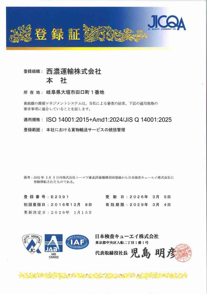 | 適用規格 | ISO14001:2015/JIS Q 14001:2015 |