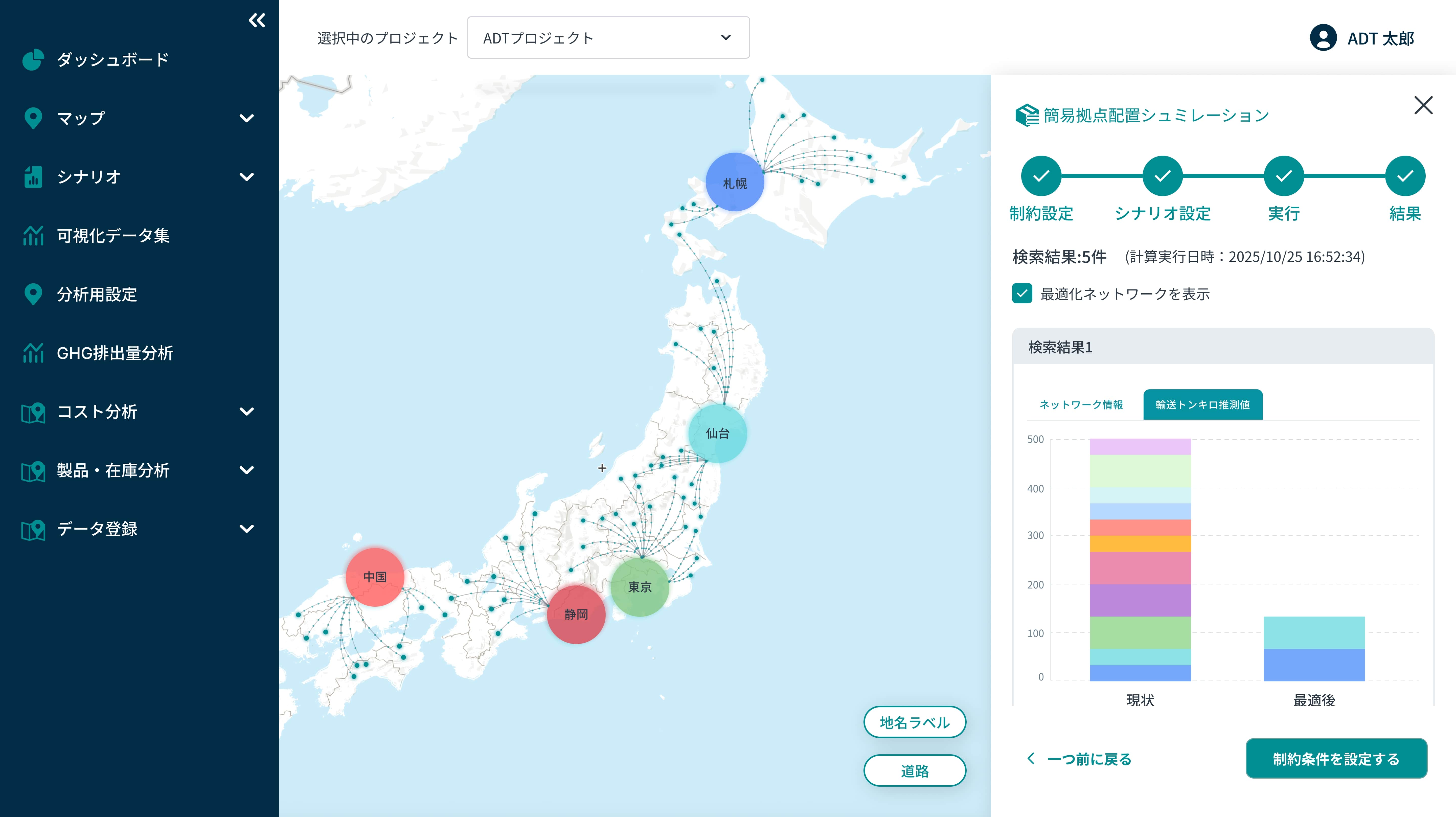 当社のデジタルツインは、物流ネットワークの最適化を強力に支援するツールです。拠点配置や輸送・在庫のバランスなど、複雑な物流要素をデータに基づき可視化し、グラフィカルに認識することで、迅速かつ合理的な意思決定をサポートします。また、拠点の再配置・統廃合など、さまざまな物流シナリオをデジタル環境上でシミュレーションすることが可能です。事前に効果検証を行い、将来的な物流リスクへの的確な予測対応や、最適物流戦略の立案を支援します。